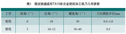 在激光快速成形TA15鈦合金飛機構件的銑削加工研究中發現,可以根據磨損和排屑等情況對銑刀進行修磨,改變銑刀的幾何參數,改善切削加工性能。采用可轉位刀具和硬質合金單刀銑削,粗加工時要求刀具前角、后角要小些,精加工時要求刀具前角、后角、螺旋角要偏大些或刀齒密些,并盡可能縮短切削刃長。加工激光快速成形TA15鈦合金飛機構件的刀具結構參數見表1。