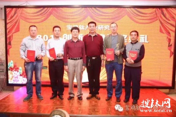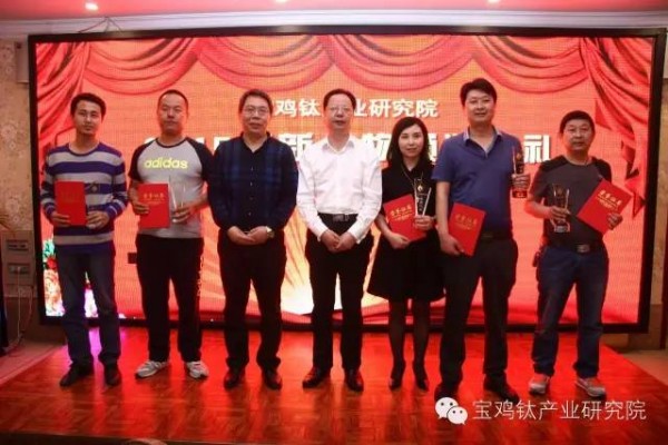 寶雞鈦產業研究院盛利院長、寇明虎副院長、馬憲斌副院長、寶雞力興鈦業集團趙力董事長、寶雞興隆鈦業張照明董事長、陜西凸鵬鈦鋯公司唐普放董事長為獲獎人員頒獎。希望獲獎人員繼續進步不斷創新,創造出寶雞鈦產業更輝煌的明天!