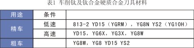 切削力不大,加工硬化也不嚴(yán)重,容易獲較好的表面光潔度。因切削溫度高,刀具磨損較大,刀具耐用度低,選擇車削鈦合金刀具材料(見表1)。