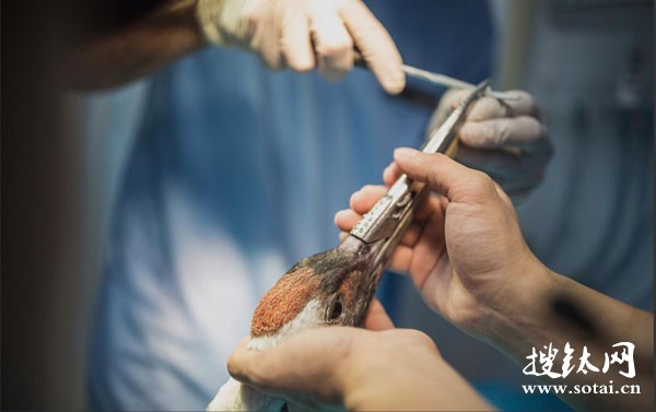 隨后給鈦合金“上喙”上鋼釘,丹頂鶴的上頜骨中空且易脆,力度需要十分輕。