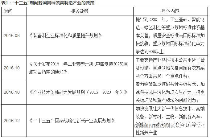 但我國距離制造強國仍有一定的距離,大而不強的問題依然突出,自主創新能力弱、關鍵核心技術欠缺、資源能源利用效率低、產業結構不合理、信息化程度不高等問題亟待解決。當務之急是通過積極發展高端裝備制造業,加快突破關鍵技術與核心部件,從而帶動制造業水平全面提升。為此,“十三五”以來國家陸續出臺了一系列促進高端裝備制造產業發展的政策文件。
