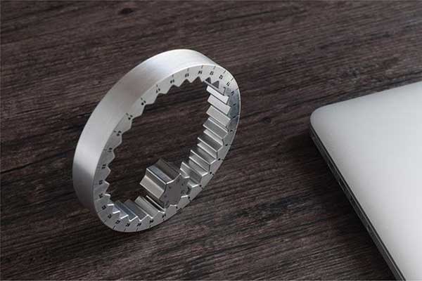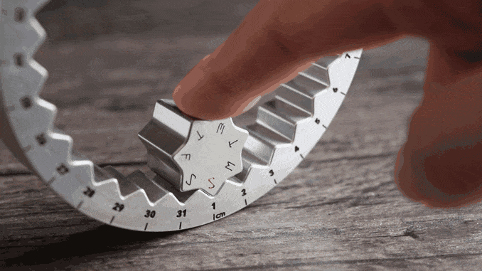 這個設計獨特的日歷又被稱為“永恒日歷”,使用鋁和鈦合金材料制成。環型部分代表月份,小一點星型則代表星期,兩部分金屬齒狀咬合一起,構成了簡單又實用的日歷。