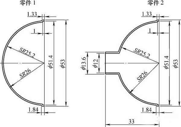 鈦合金球殼封頭為壁厚0.8mm的異型零件,母材為直徑54mm、長(zhǎng)度65mm的實(shí)心鈦棒,要求加工零件1和零件2各一件,形狀雖簡(jiǎn)單,但無(wú)裝夾位置,壁薄、精度要求高,且加工完成后還有質(zhì)量要求,單件質(zhì)量為(19±1.5)g,材料硬度高、彈性好,切屑難以斷落,屬于加工難度較高的零件。