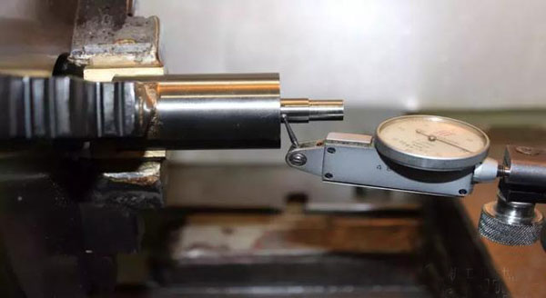 2、半精車:待零件徹底冷卻后,再使用90°外圓偏刀將零件的基準外圓車出,通過軟爪夾持零件外形,利用微米杠桿表校正零件外形(見圖3),使圓跳動達到0.005mm以內,對零件一頭進行加工,不能一次加工到位,單邊留余量0.1~0.2mm。