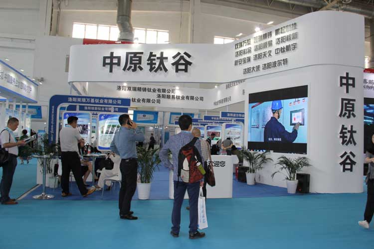 中原鈦谷企業群展示鈦合金緊固件、鈦鑄件、艦船海軍用鈦材、鈦合金閥門、螺旋槳等鈦制品。