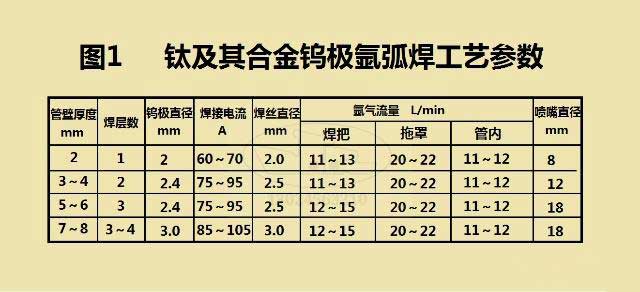 鈦管的焊接參數非常重要,常用鈦合金管的焊接工藝參數見圖1。