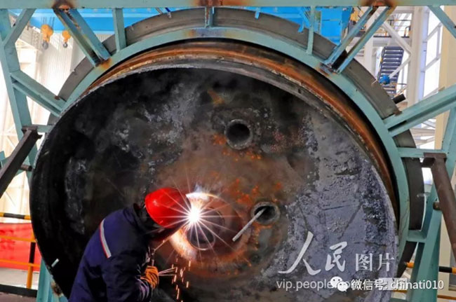工人在新疆湘晟新材料生產(chǎn)車間焊接設備。