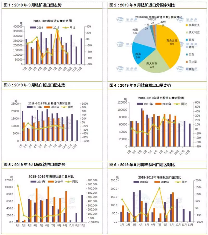 根據(jù)海關(guān)數(shù)據(jù),2019年9月中國鈦礦進(jìn)口數(shù)量為12.48萬噸,環(huán)比下降38.24%,同比下降44.61%。其中進(jìn)口數(shù)量前三名國家為:莫桑比克,澳大利亞、越南。1-9月鈦礦進(jìn)口數(shù)量共計(jì)為180.17萬噸,同比去年242.05萬噸下降約60萬噸,下幅25.57%。進(jìn)口鈦礦大幅減少主要因部分礦山的枯竭、印度、越南鈦礦出口限制政策及國家對放射性元素的管制,隨著國內(nèi)氯化法在建產(chǎn)能的釋放,氯化法鈦原料緊張,價格將繼續(xù)高位運(yùn)行。