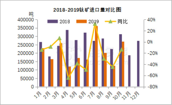 根據(jù)海關(guān)數(shù)據(jù),2019年10月中國鈦礦進(jìn)口數(shù)量為27.04萬噸,環(huán)比增長116.68%,同比下降13.53%。1-10月鈦礦進(jìn)口數(shù)量共計(jì)為207.21萬噸,同比去下降約66萬噸,下幅24.19%。