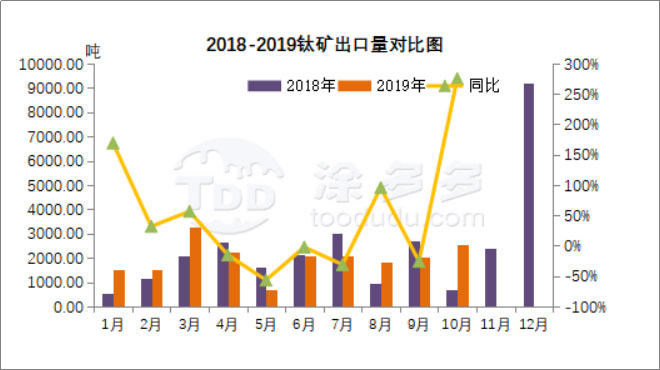 2019年10月中國鈦礦出口2535.48噸,同比增長275.07%,環(huán)比增長19.35%。1-10月累計(jì)出口19773.14噸,同比增長17.07%。