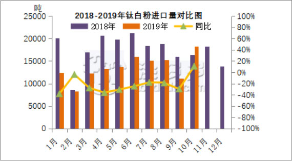根據(jù)海關(guān)數(shù)據(jù),2019年10月中國鈦白進(jìn)口約1.82萬噸,同比增長10.77%,環(huán)比增長63.00%。2019年1-10月總進(jìn)口約13.56萬噸,同比減少23.43%。