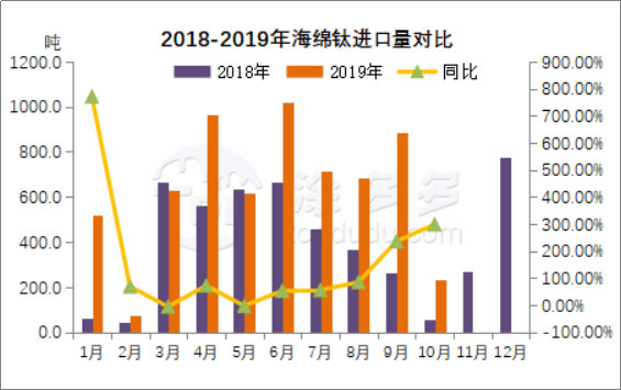 根據(jù)海關(guān)數(shù)據(jù),2019年10月中國海綿鈦進(jìn)口235.5噸,同比增長297.80%,環(huán)比降低246.45%,進(jìn)口國家為日本、烏克蘭、哈薩克斯坦。1-10月累計(jì)進(jìn)口6348.8噸,同比增長67.6%。