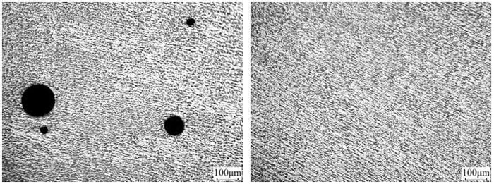 高溫鈦合金激光沉積成形組織形貌(左圖:優化前 右圖:優化后)