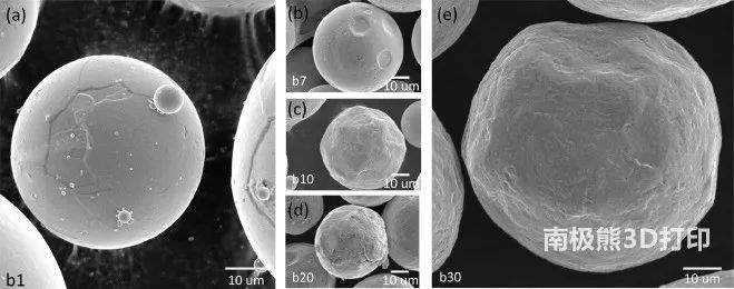 圖5.重復使用過程中粉末尺寸和形態(tài)的變化。(a)在原始粉末(b1)中,顆粒表面相對光滑并且具有高球形度。有許多細小顆粒會聚結或粘附在較大顆粒的表面。(b)-(d)中b7,b10和b20中粉末的代表視圖分別顯示了顆粒表面損壞的進展和不存在細小顆粒的情況。在b30(e)中,顆粒是不規(guī)則的,具有一些主要變形和損壞。