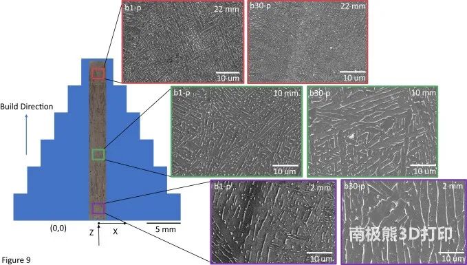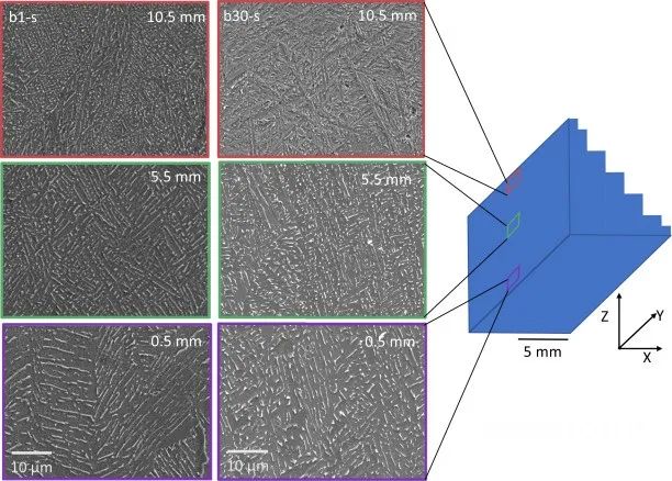 圖9.金字塔形試樣從底部到頂部的距零件底部2、10和22mm的微觀結構。在每個高度上,從b1(左)和b30(右)顯示了顯微照片。請注意,從金字塔的底部到頂部,籃狀圖案趨于緊密。