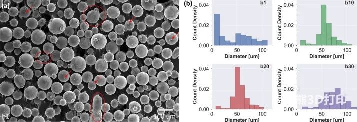 圖3.粉末特性 (a)b1的原始粉末的顯微照片。紅色箭頭突出顯示了原始粉末中存在的選定小顆粒。紅色圓圈突出顯示一些不規(guī)則顆粒。(b)粉末尺寸從b1擴展到b30。