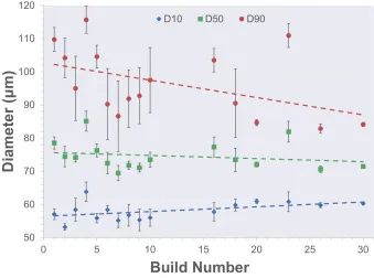 圖4.粉末尺寸分布以及在30個構建中重復使用粉末的情況。根據(jù)LSPA確定繪制第10,第50和第90個百分位。