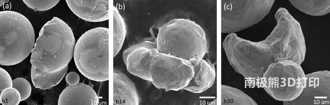 圖6. b1,b14和b30粉末中的受損顆粒示例。分別顯示了(a)破裂,(b)團聚/熔融和(c)熔融/不規(guī)則顆粒的樣品。通常,在通過SEM評估的所有結構的粉末中都發(fā)現(xiàn)了這些類型的損壞顆粒。