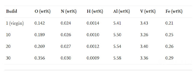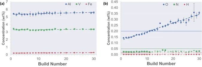 (3)隨著粉末的重復使用,O污染呈線性增加,并且在30個構建周期內增加了一倍以上。通過b11,O的濃度超過了0.2wt%的極限。