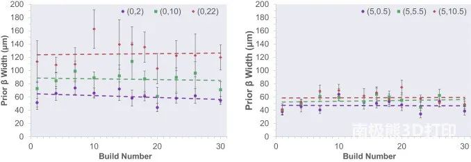 (5)金字塔中心軸的α板條厚度隨成型高度的增加而減小,隨粉末再利用而略有增加。這表明冷卻速度隨構建高度的增加而增加。相反,中心軸先前的β晶粒寬度隨成型高度而增加,但隨著粉末再利用而沒有增加。這意味著超過β轉變點的時間隨構建高度的增加而增加,但是粉末再利用不會影響超過β轉變點的時間。