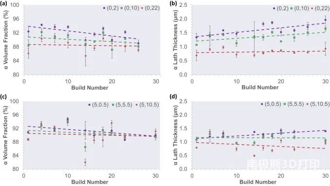 圖11.α含量的微觀結構參數(shù)。(a)金字塔樣品的α體積分數(shù)百分比。(b)金字塔樣本的α板條厚度(以微米為單位)。(c)和(d)分別與(a)和(b)相同,但對于階梯試樣。