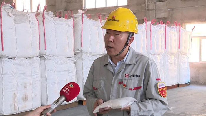 甘肅東方鈦業有限公司綜合管理部副部長 肖成虎:像我手里拿的這一款呢,就是我們2019年自主研發的一種高白度金紅石型鈦白粉粗品,我們通過自動化控制系統,來有效控制它的粒徑,來有效控制這個轉窯的搖速,最后增加了這個白度性能,有效提高了鈦白粉的這個顏料性能。