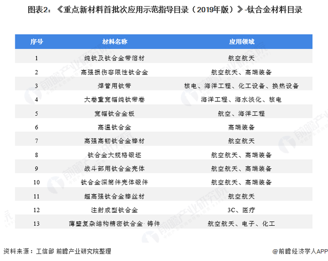 根據《重點新材料首批次應用示范指導目錄(2019年版)》,目前,我國為了鼓勵高端鈦合金材料的發展,共有13款鈦材料入選《目錄》: