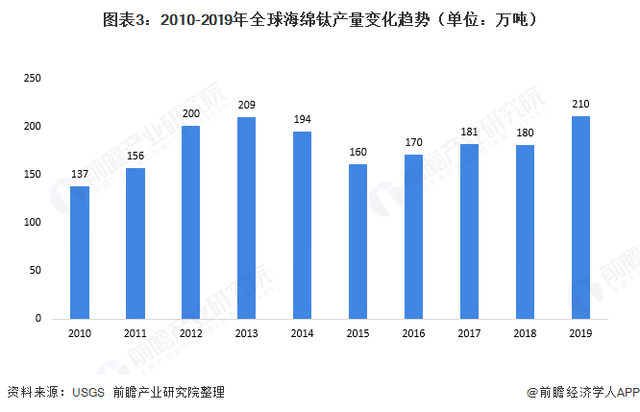 數據顯示,2010-2019年,全球海綿鈦產量呈波動增長趨勢。2010-2013年,全球海綿鈦產量從137萬噸增長至209萬噸;2014年以后,受主要國家產量下滑影響,全球產量也逐步下滑;至2019年,全球海綿鈦產量達210萬噸,較2018年增長了30萬噸。