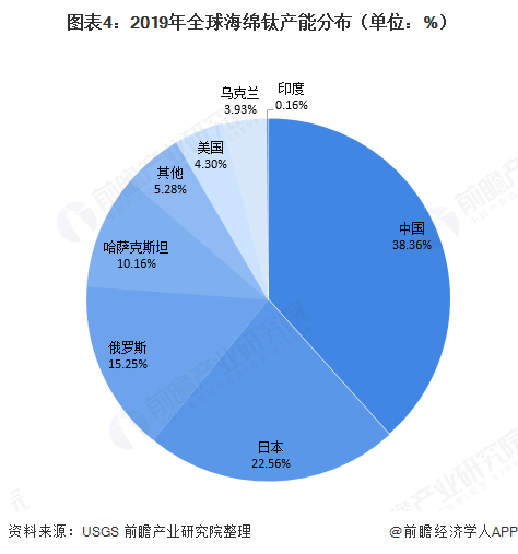 從全球海綿鈦的產能分布來看,2019年,中國海綿鈦產能居全球首位,占比達38.36%;其次是日本,產能占比達22.56%;俄羅斯和哈薩克斯坦的產能占比也較高,分別達15.25%和10.16%。