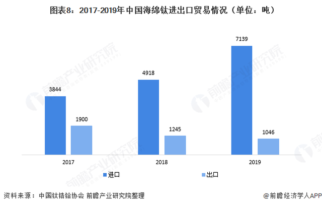 在產品進出口貿易方面,2019年,受國內原料供應緊缺所造成的原料價格上漲,以及高端鈦市場需求的驅動,我國海綿鈦進口量大幅增長45.2%,達7139噸,主要因國內鈦加工企業對國外高品質海綿鈦需求的爆發式增長;在出口貿易方面,2019年海綿鈦出口量同比減少16%。