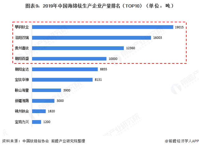 在企業競爭格局方面,2019年,我國海綿鈦產量在10萬噸以上的企業共有4家,分別是攀鋼鈦業、洛陽雙瑞、貴州遵鈦和朝陽百盛,其中,攀鋼鈦業的產量最大,達19萬噸。