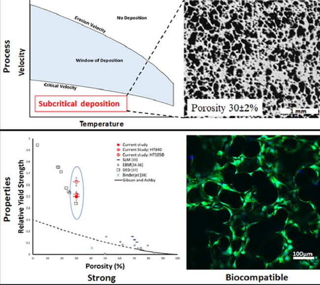 介于本公號讀者普遍的知識結構,冷噴涂和3D打印等基礎概念都不再贅述。簡單地說,這項技術主要利用粉體超音速沖擊形成固態鍵合,在遠低于融融溫度工況下生產出高強度多孔鈦合金,并可以通過后熱處理進一步提升機械性能,最終將其應用于骨科移植等領域。如上圖所示。